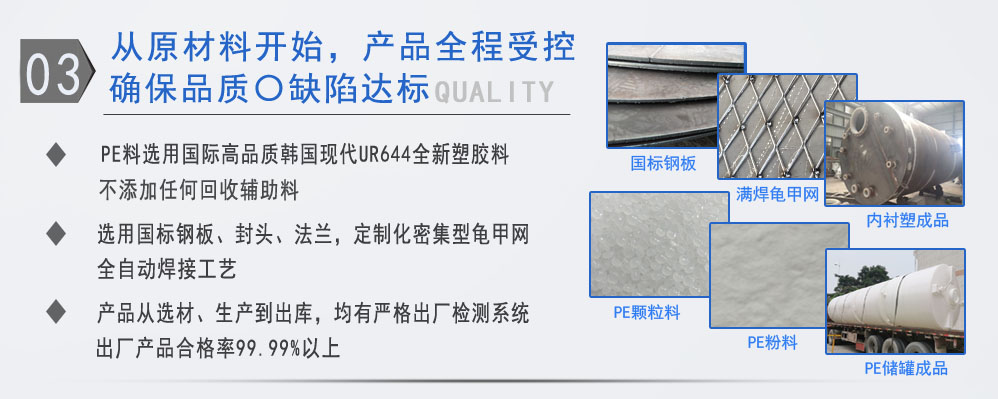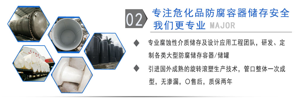 公司有鋼襯塑PE/PO、PE全塑、碳鋼、不銹鋼四大系列100多個品種,專注于常壓儲存容器生產,其產品包括鋼襯塑儲罐、管口一體成型PE儲罐、碳鋼儲罐、不銹鋼儲罐、反應釜、攪拌罐、離子交換柱、鋼襯PE/PO儲罐、塑料儲罐鹽酸儲罐硫酸儲罐等等。更大限度滿足廣大客戶的各種需求,同時可以根據客戶的需要加工定制各種防腐設備。